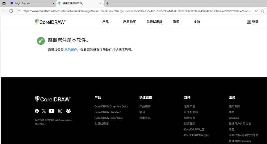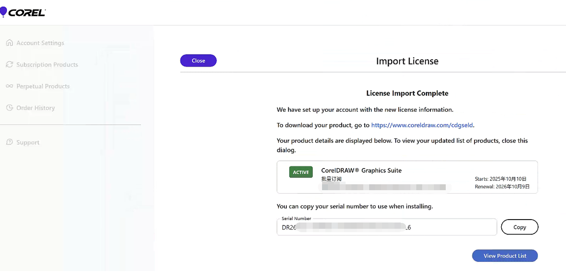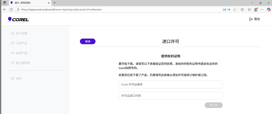 3.使用邮箱创建新CDR账户或用已有帐户登录,默认此账户绑定用户序列号(此账户可以不是用户下单邮箱)输入代码后可以获取用户的序列号,导入Corel许可证号和软件许可证号(在交付邮件里有这两项内容),进入许可证后台。