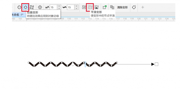 3、在属性栏中,从左到右依次有变形方式、拉链振幅、拉链频率、变形范围等参数。其中,幅度越大,波浪起伏越明显。频率越高,波浪越密集。如果想得到整齐规律的波动效果,可以用下图红框中的设置。调整振幅和频率后就能得到波浪线了。